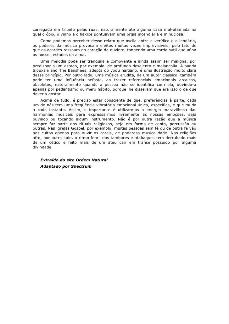 2. 2. carregado em triunfo pelas ruas, naturalmente até alguma casa mal-afamada na qual o ópio, o vinho e o haxixe pontuavam uma orgia incendiária e minuciosa. Como podemos perceber desse relato que oscila entre o verídico e o lendário, os poderes da música provocam efeitos muitas vezes imprevisíveis, pelo fato de que os acordes ressoam no coração do ouvinte, tangendo uma corda sutil que afina os nossos estados da alma. Uma melodia pode ser tranqüila e comovente e ainda assim ser maligna, por predispor a um estado, por exemplo, de profundo desalento e melancolia. A banda Siouxsie and The Banshees, adepta do vodu haitiano, é uma ilustração muito clara desse princípio. Por outro lado, uma música erudita, de um autor clássico, também pode ter uma influência nefasta, ao trazer referenciais emocionais arcaicos, obsoletos, naturalmente quando a pessoa não se identifica com ela, ouvindo-a apenas por pedantismo ou mero hábito, porque lhe disseram que era isso o de que deveria gostar. Acima de tudo, é preciso estar consciente de que, preferências à parte, cada um de nós tem uma freqüência vibratória emocional única, específica, e que muda a cada instante. Assim, o importante é utilizarmos a energia maravilhosa das harmonias musicais para expressarmos livremente as nossas emoções, seja ouvindo ou tocando algum instrumento. Não é por outra razão que a música sempre faz parte dos rituais religiosos, seja em forma de canto, percussão ou outras. Nas igrejas Gospel, por exemplo, muitas pessoas sem fé ou de outra fé vão aos cultos apenas para ouvir os corais, de poderosa musicalidade. Nas religiões afro, por outro lado, o ritmo febril dos tambores e atabaques tem derrubado mais de um cético e feito mais de um ateu cair em transe possuído por alguma divindade. Extraído do site Ordem Natural Adaptado por Spectrum